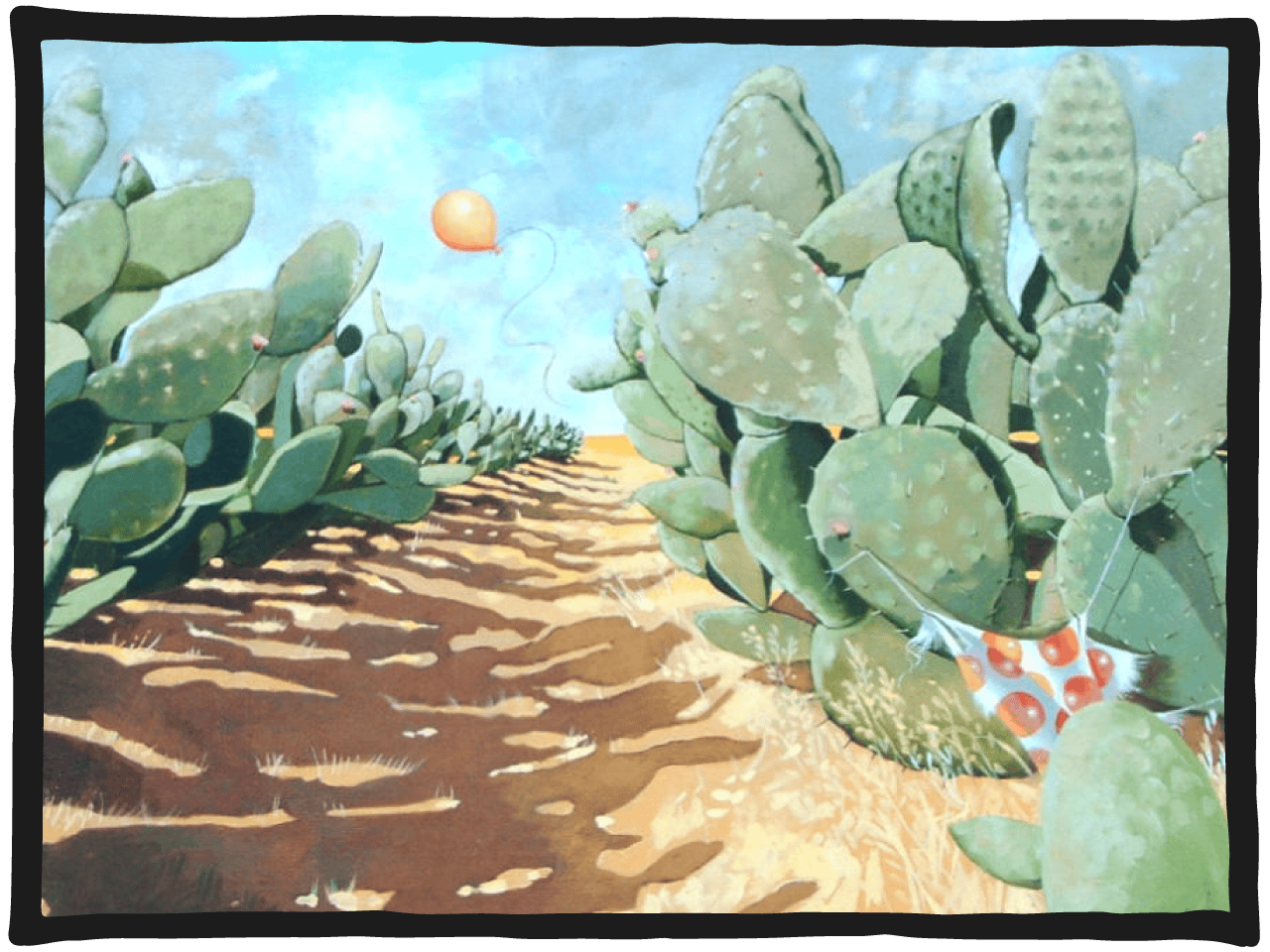 ‘Prickly Pear Field, Sunbury’ by Felicity Marshall transports viewers into a landscape tinged with both memory and timelessness. A dirt path winds through a cactus field, leading towards an orange balloon suspended against a blue sky. The scene recalls Felicity’s experiences across desert regions, from Western Australia to Mexico and Texas, bringing together past, present, and future in one expansive visual journey. The work embodies her ability to turn fleeting moments into enduring, dreamlike images.