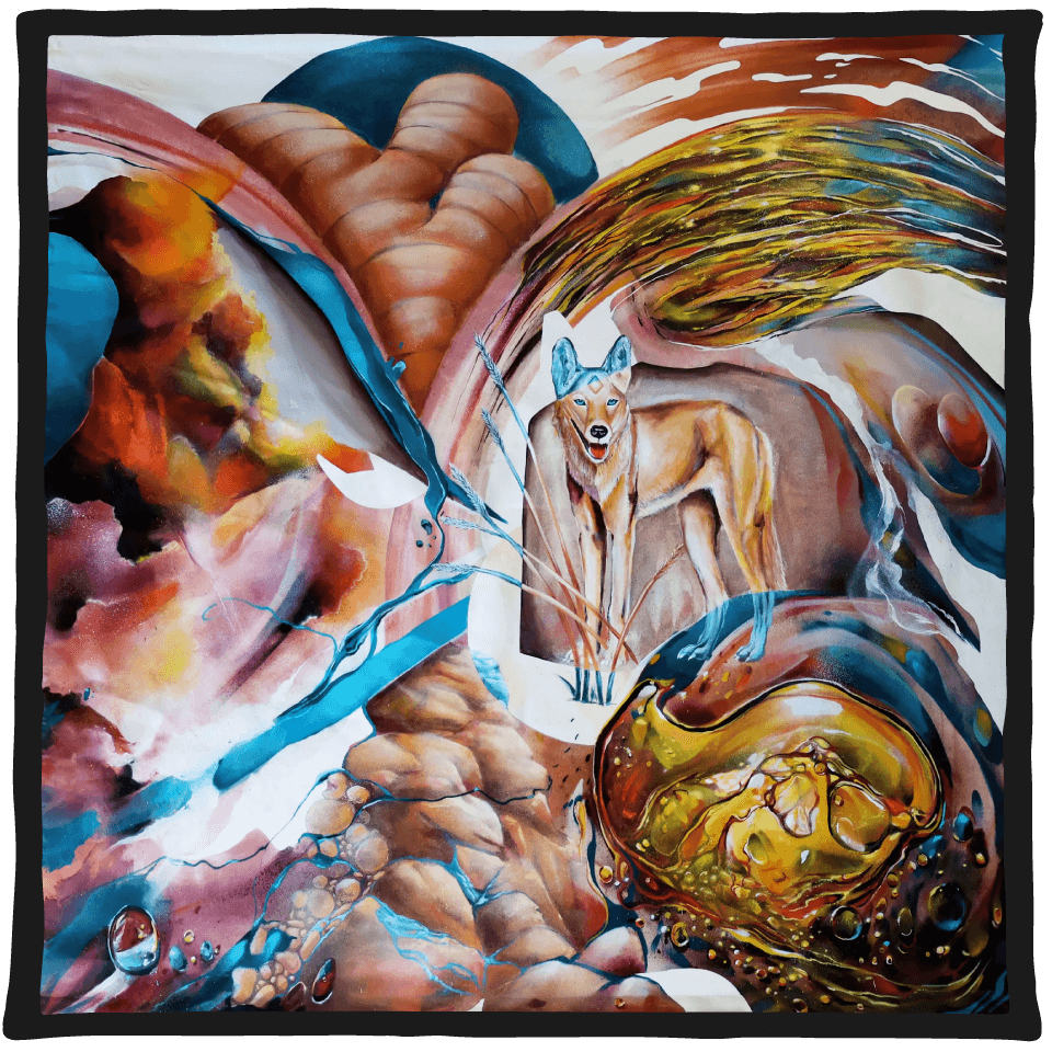 The swirling, organic forms evoke the bubbling energy of fermentation, where microorganisms transform ingredients. Central to the composition is the dingo, a symbol of Queensland’s wild and untamed spirit. Partially enveloped in an ethereal, spiritual dimension, the dingo’s blue hues symbolise its role as a guardian spirit. Its presence ties the brewing process to a deeper, almost mystical connection with nature.