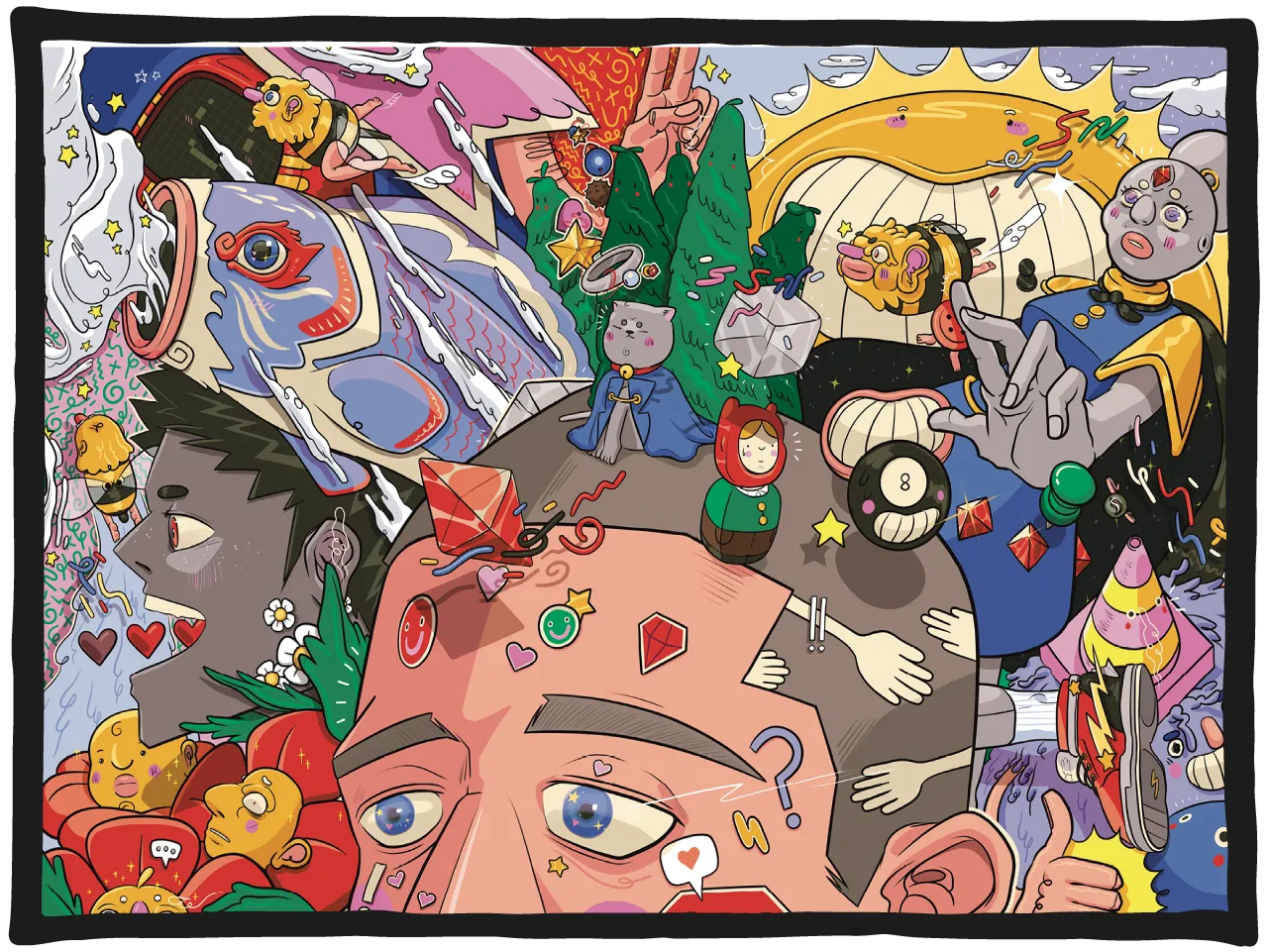 “When stimulated by a place, sound, feeling or scent, one is on occasion magically transported to the depths of nostalgia…” Lachlan Orton’s statement for Rushing Back sets the tone: memory as a portal, whimsy with a bitter-sweet edge. Raised in rural Gippsland and now based in Melbourne, the 19-year-old illustrator folds personified emotions, creatures, and everyday keepsakes into colourful scenes that feel like daydreams caught mid-flight. His practice is deliberately eclectic – part childhood scribble, part graphic design rigour – with characters that express internal states more than literal stories.