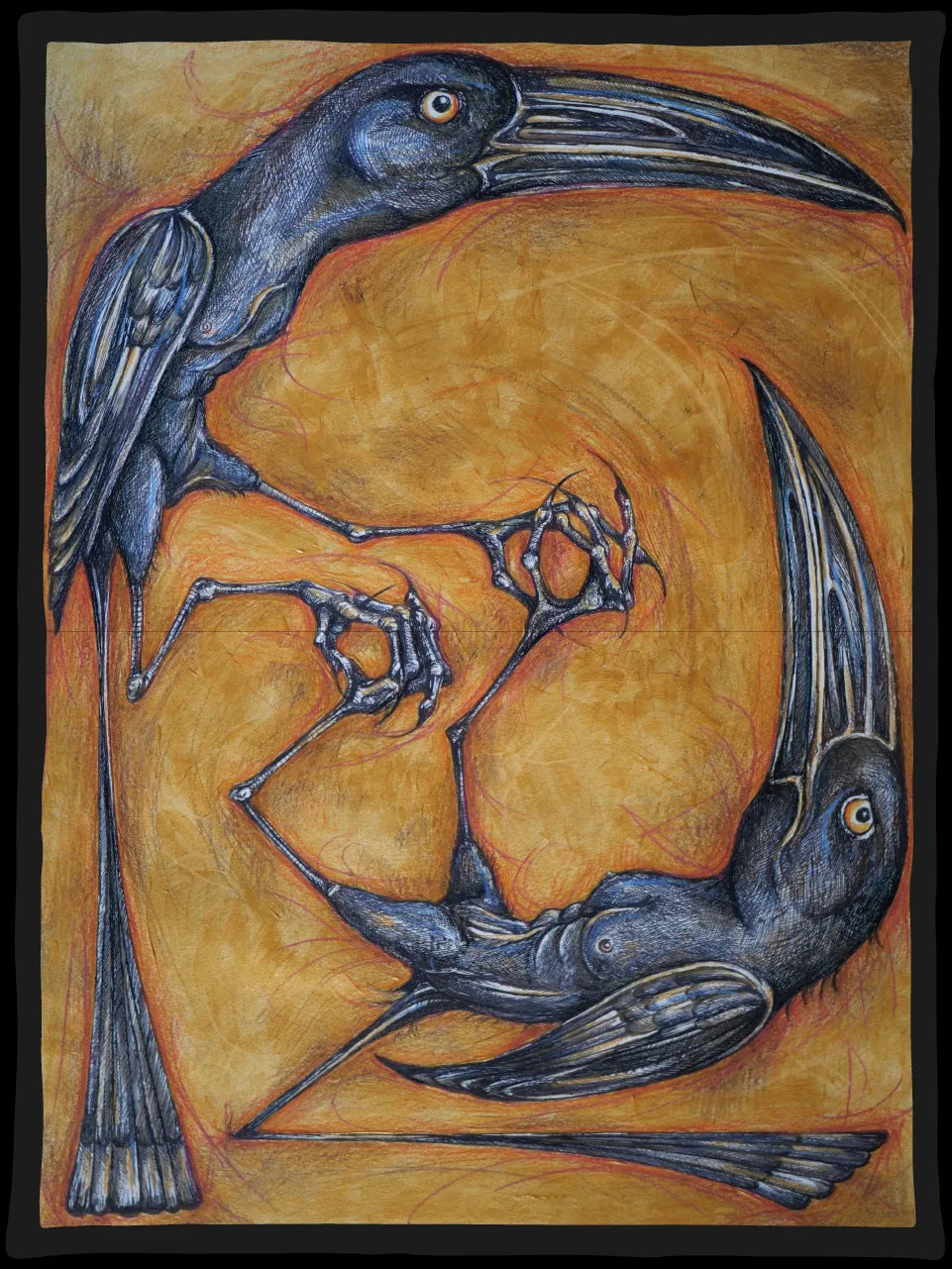 Mel’s etching Spree I was one of two works created in response to the prompt “Kiss or Kill.” The piece depicts anthropomorphic currawongs bent into a border-like configuration, eyes sharp, beaks smiling, hands joined in mutual satisfaction. It’s unsettling yet magnetic, playful yet macabre. This juxtaposition of humour and menace runs throughout their body of work, offering viewers both delight and discomfort.