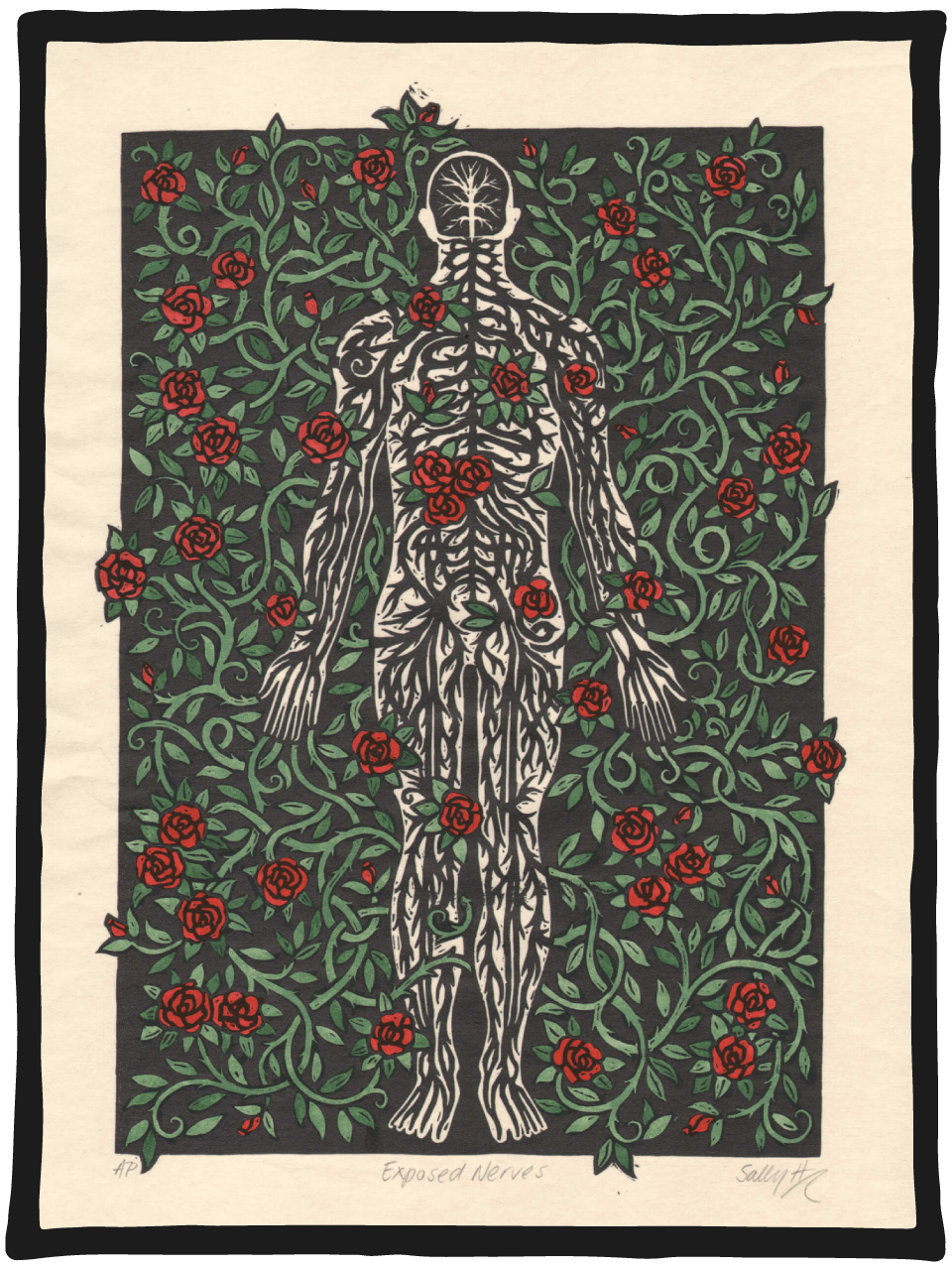 Her hand-coloured lino print Exposed Nerves was chosen to represent Aether’s Twisted Vine – one of our most-loved beers, re-released for our sixth birthday. The piece twists thorny vines into patterns that echo both the nervous system and the risks of opening yourself up. Vulnerability, protection, resilience: it’s all there, and it spoke directly to our own reflections as a brewery hitting a milestone.