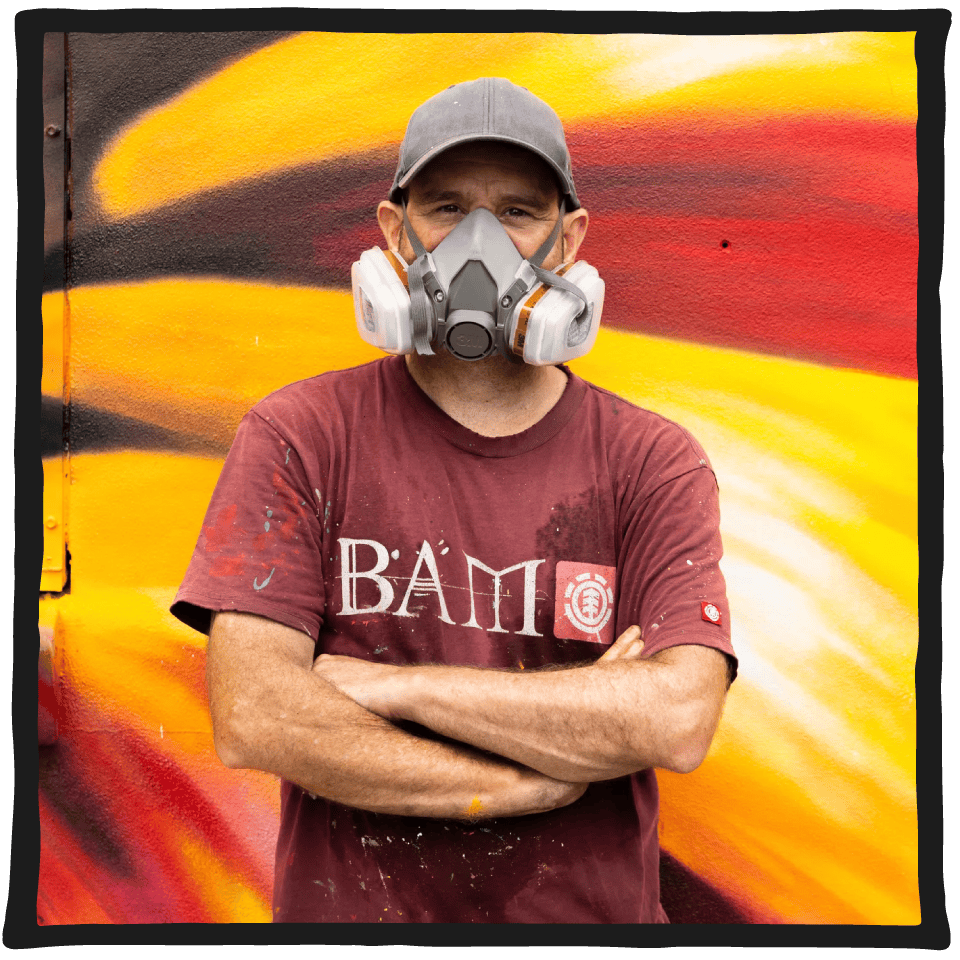 Sevens is a Brisbane-based painter whose work spans large-scale murals and studio canvases. His practice is rooted in acrylics, often layered with charcoal and oil pastels for grit and texture. He thrives on scale – the impact of towering murals matched with the intimacy of studio works that reward close attention. Both carry his signature mix of self-expression, nostalgia, and reflection on the everyday.