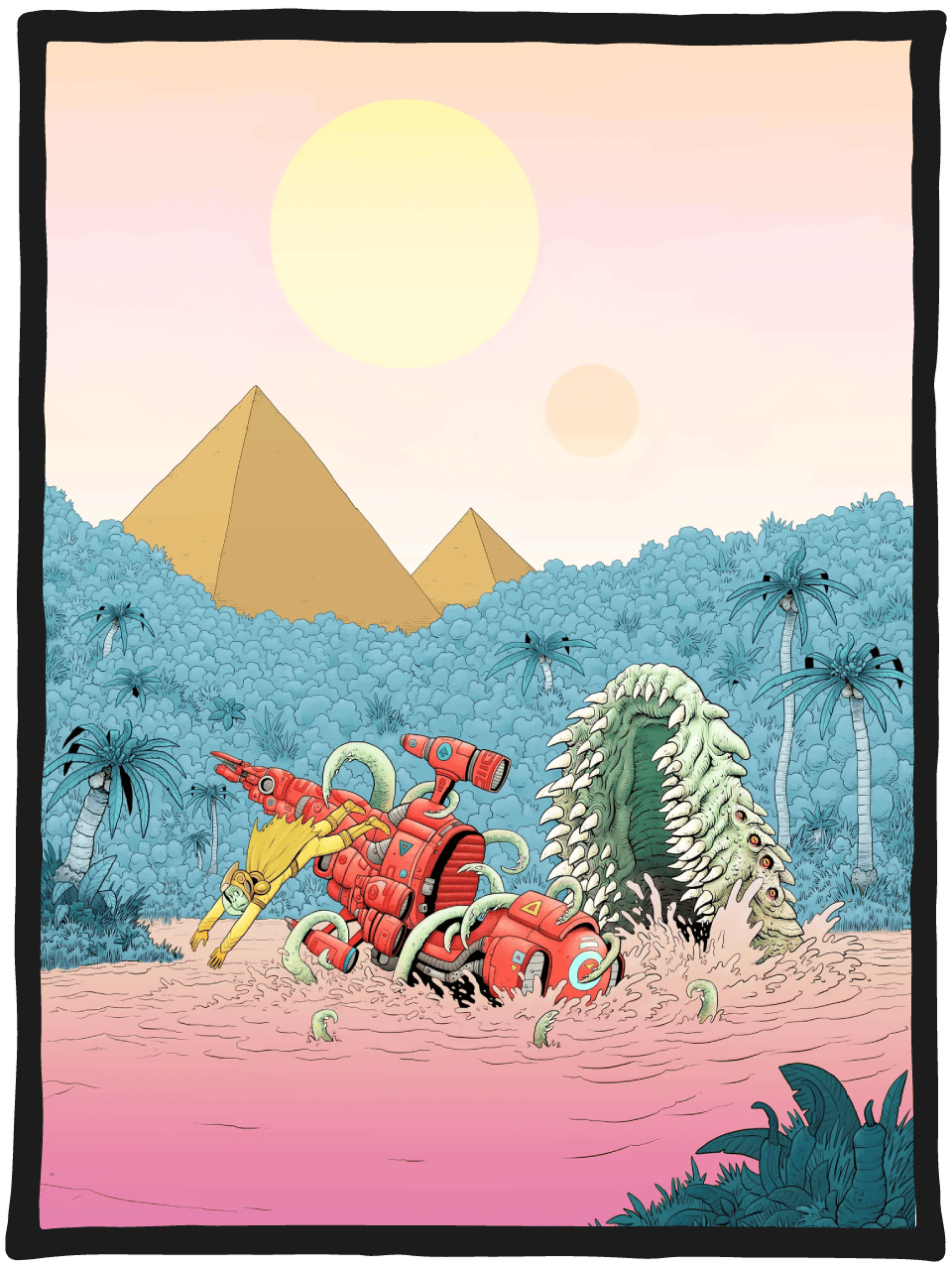 “The Monkey Sailor” keeps turning up in Tim Molloy’s pre-apocalyptic universe – sailing cosmic seas, courting disaster with a grin. Molloy’s practice spans surreal comics, paintings and sculpture, stitched together by dream logic, symbolism, and a black-humour ballast that stops the dread from capsizing the boat. Themes recur – death and rebirth, expanding consciousness, self-destruction and discovery – all drawn with a confident, fever-bright line.